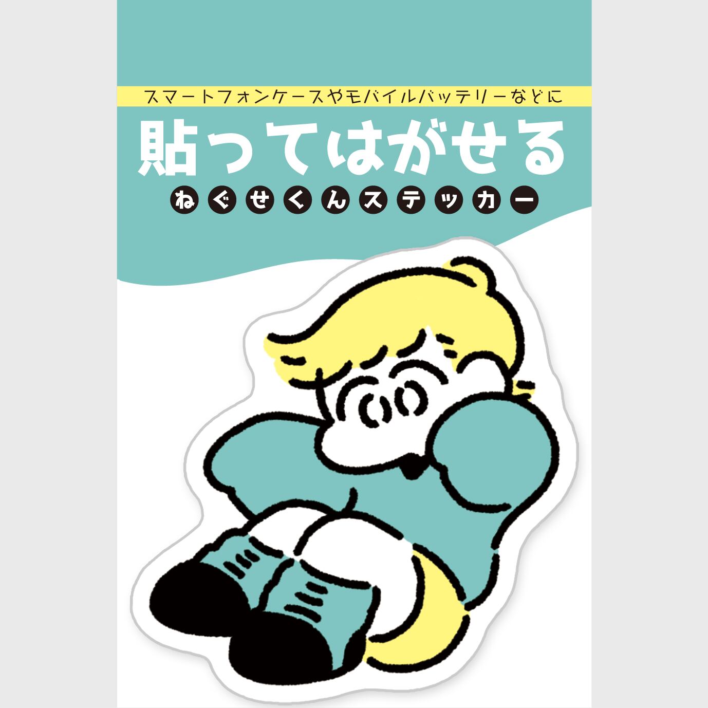 スマートフォンやモバイルバッテリーなどのツルツルした素材に貼ってはがせる(再剥離)水に強い光沢フィルムねぐせくんステッカー。
